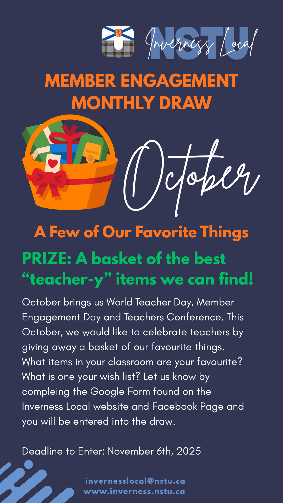 "Vince will retire in June 2025 after over 30 years of dedicated teaching. Throughout his career, he has served the students and families of Inverness Education Centre/Academy. For more than half of his teaching career, Vince has also been a tireless advocate for his colleagues through his work with the Inverness Local, serving at the provincial, regional, and local levels. His leadership roles include representing the Inverness Local on the Article 60 Committee, serving as Vice-President of Economic Welfare, and concluding his career as President of the Inverness Local. Vince has devoted countless hours to supporting and advocating for teachers, ensuring their voices are heard and their needs addressed. His inclusive and collaborative leadership has encouraged many within our local to become actively involved in committees, workshops, and executive roles. We extend our sincere appreciation and thanks to Vince for his many contributions to the Inverness Local."